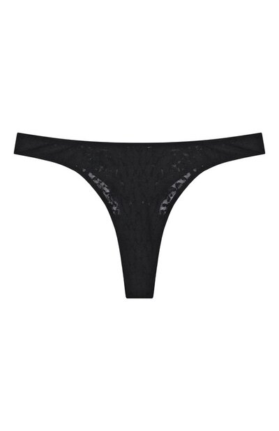 Трусы-стринги с анималистичным мотивом выполнили из нейлонового кружева с добавлением эластана. Края изделия укрепили узким кантом.