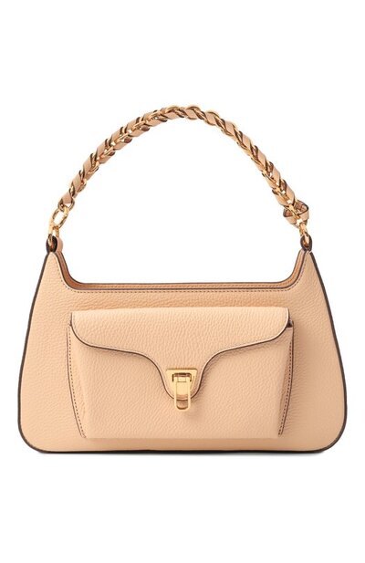 Сумку Beat Generation со съемными регулируемым ремнем и ручкой-цепочкой с плетением выполнили из зернистой кожи. Помимо внутреннего кармана у изделия предусмотрели и внешний, закрывающийся клапаном с застежкой в форме фирменного плектра.