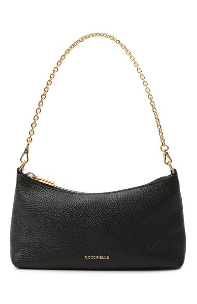 Сумку Aura со съемными ручкой-цепочкой и регулируемым плечевым ремнем сшили из зернистой кожи. Спереди изделие украсили логотипом марки. Модель с тремя внутренними карточными слотами закрывается молнией.