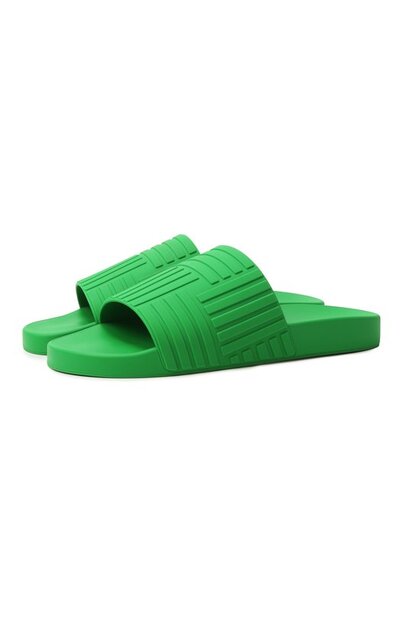 Шлепанцы с формованной стелькой выполнили из резины оттенка Parakeet. Союзку украсили крупным тиснением, напоминающим фирменное плетение intrecciato.