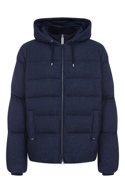 Пуховик из микса шелка и кашемира дополнили трикотажными манжетами и воротником-стойкой. Куртку с регулируемым капюшоном утеплили гусиным пухом и пером. По бокам предусмотрели врезные карманы, подчеркнув их листочки металлическими пластинами. Модель на подкладе из полиэстера застегивается встречной молнией.