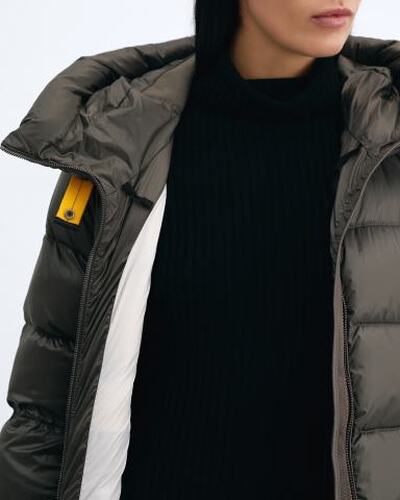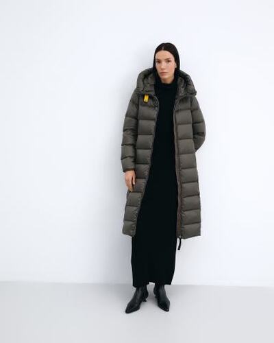 Удлиненная стеганая куртка из линейки Sheen от Parajumpers отличается простым кроем и удобной конструкцией. Материал верха — саржа из полиэстера и нейлона с водоотталкивающей пропиткой и суперпухонепроницаемым покрытием на спинке, подкладки — тафта из переработанного нейлона плотностью 20 ден. Наполнитель — 100% утиный пух. У модели регулируемый капюшон на шнурке, вентиляция под мышками, манжеты с отделкой из лайкры, два кармана на молнии. Рукав украшен фирменной нашивкой Parajumpers, воротник — съемной желтой лентой.