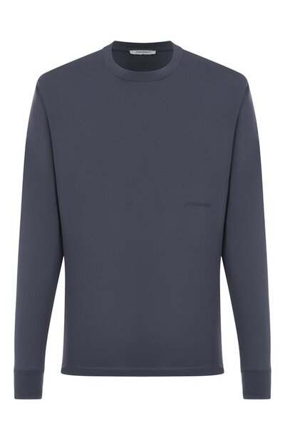 Лонгслив со слегка спущенной линией плеч выполнили из хлопкового трикотажа. Принадлежность модели бренду обозначили небольшим фирменным логотипом спереди.