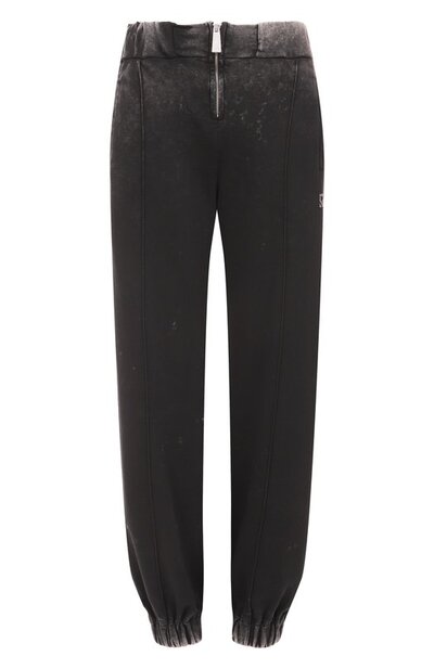 Неравномерно выбеленные джоггеры с двумя карманами по бокам и еще парой сзади выполнили из хлопкового трикотажа. Модель с эластичным поясом застегивается короткой молнией спереди.