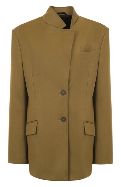 Жакет с акцентированной линией плеч выполнили из габардина на основе шерсти первого пострига, а для подкладки выбрали вискозу. Модель со шлицей сзади дополнили нагрудным и двумя боковыми карманами.
