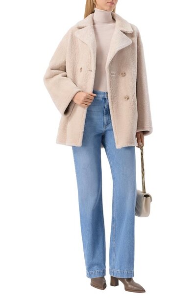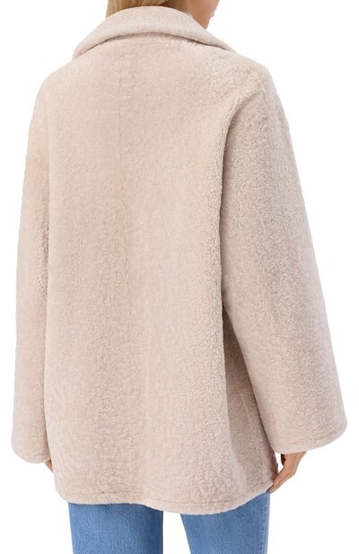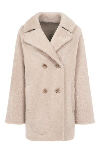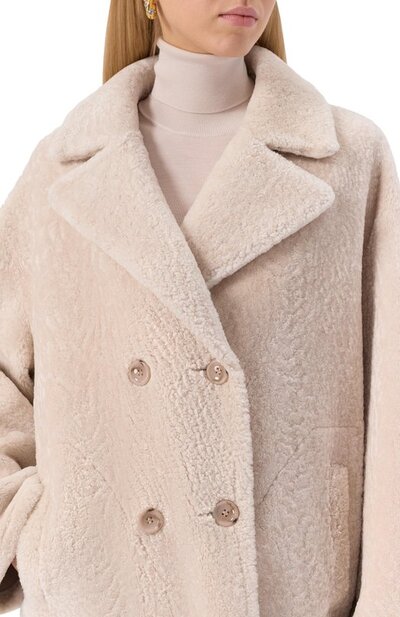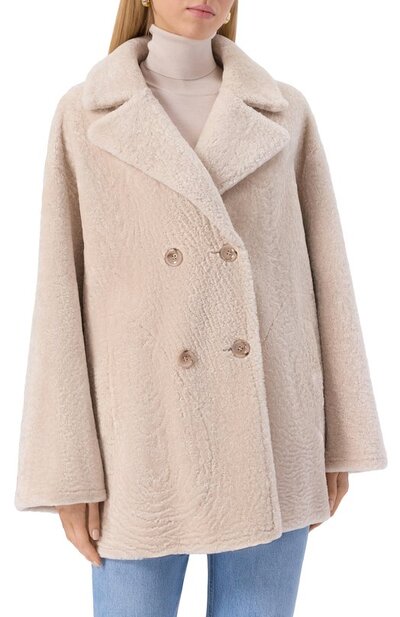 Двубортную дубленку с заостренными лацканами и отложным воротником выполнили из коротковорсовой овчины ягненка. Модель с двумя карманами застегивается роговыми пуговицами.