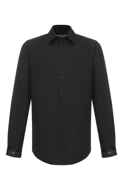 Для изготовления рубашки с фигурным низом и слегка спущенной линией плеч использовали хлопковый поплин. Прямоугольные манжеты украсили атласными лентами с контрастным логотипом.