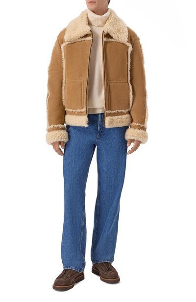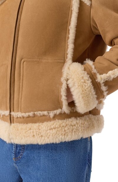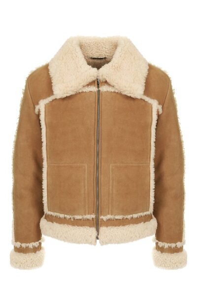 Укороченную дубленку на молнии выполнили из овчины. Пояс, манжеты, широкий воротник и швы подчеркнули контрастным мехом. По бокам предусмотрели крупные карманы.