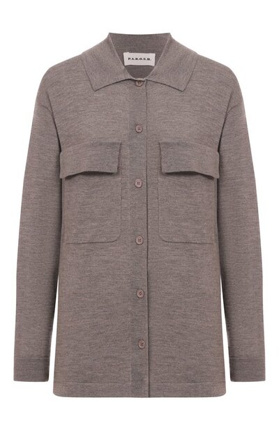 Кардиган со спущенной линией плеч выполнили из шерстяного трикотажа с добавлением кашемира и эластана. Модель с двумя нагрудными карманами и отложным воротником, как у рубашки, застегивается пуговицами в тон.