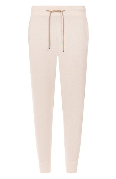 Для изготовления джоггеров с отделкой в рубчик использовали пряжу из шерсти и кашемира. Модель с регулируемым поясом-кулиской дополнили боковыми карманами и задними, на одном из которых – фирменная этикетка.