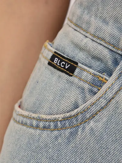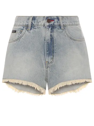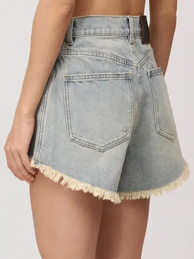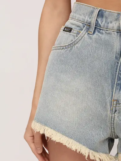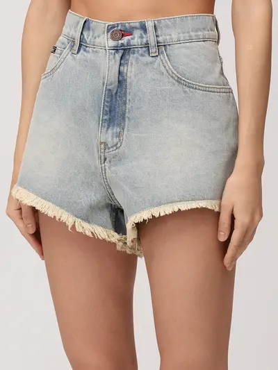 -Голубые шорты из хлопкового денима от BLCV. -Модель свободного кроя с высокой посадкой, поясом со шлевками, прорезными и накладными карманами, застежкой на молнию, нашивкой с логотипом бренда сзади, декором густой бахромой по низу брючин.