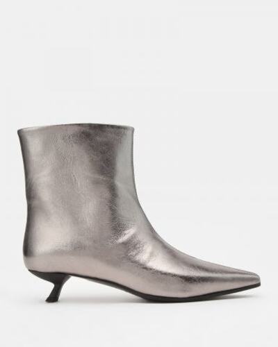 Ботильоны Principe di Bologna выполнены из тактильной натуральной кожи с эффектом металлик. Внутренняя подкладка и стелька обладают высокой адаптивностью к форме стопы и воздухопроницаемостью, что обеспечивает максимальный комфорт на протяжении всего дня. У модели заостренная носочная часть и маленький скульптурный каблук kitten heel. Подошва выполнена из прочной резины.