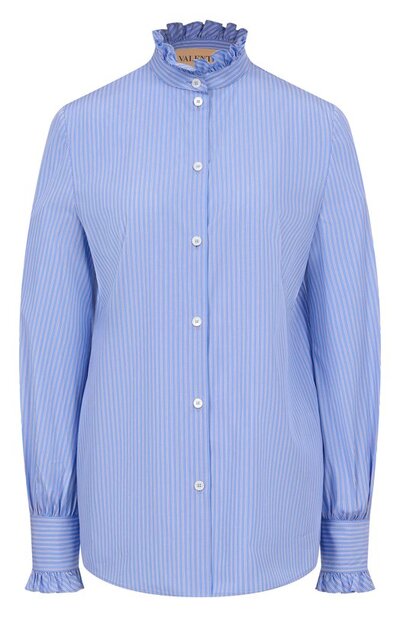 Рубашку с мелкими складками на спинке выполнили из хлопкового поплина в вертикальную полоску. Спереди вышили монограмму VG, а воротник «мандарин» и манжеты подчеркнули оборками.