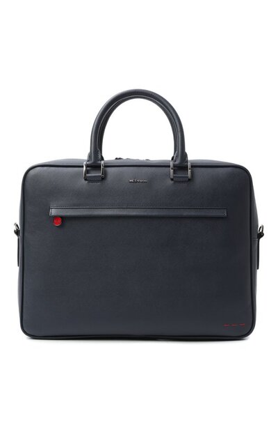 Для изготовления портфеля с двумя ручками и съемным плечевым ремнем использовали сафьяновую кожу. Внешний и внутренний карманы, как и сам аксессуар, застегиваются молниями с брендированными круглыми пуллерами.