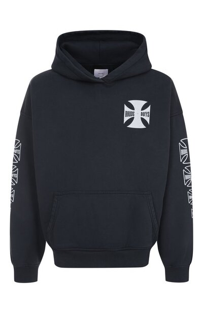 Худи свободного кроя выполнили из плотного хлопкового трикотажа. Модель с карманом «кенгуру» украсили принтами Rhude Boys спереди, на спинке и вдоль рукавов.
