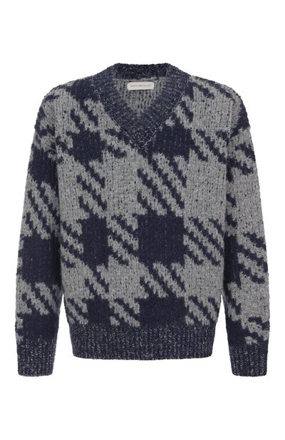 Свитер с крупным клетчатым узором «пье-де-пуль» связали из ворсистой пряжи на основе шерсти овцы и альпака с добавлением нейлона. Oversize-модель с V-образным вырезом и отделкой в рубчик станет основой комфортного повседневного комплекта.