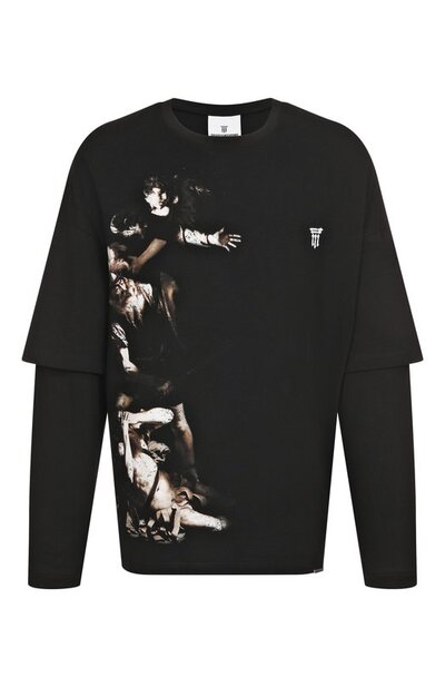 Oversize-лонгслив, напоминающий двухслойный комплект с футболкой, выполнили из хлопкового трикотажа. Спереди модель декорировали эмблемой и потертым принтом в виде репродукции картины Караваджо, а на спинке – текстом с информацией о творчестве художника.