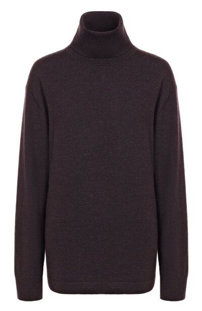 Водолазку свободного кроя выполнили из тонкого стрейчевого трикотажа на основе шерсти с добавлением кашемира. Модель с разрезом на отвороте высокой горловины дополнили манжетами с пуговицами.