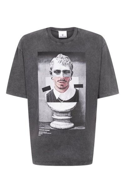 Футболку свободного кроя выполнили из выбеленного хлопкового джерси. Спереди модель декорировали фотопринтом в технике коллажа.