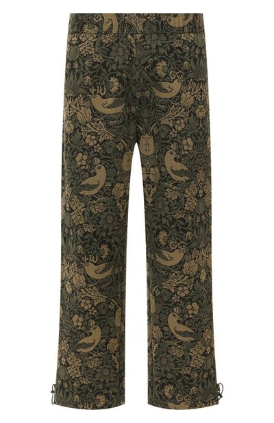Брюки прямого кроя сшили из фактурного микса хлопка и полиэстера с жаккардовыми узорами. Модель с эластичным поясом и четырьмя врезными карманами дополнили внизу кулисками с фиксаторами.