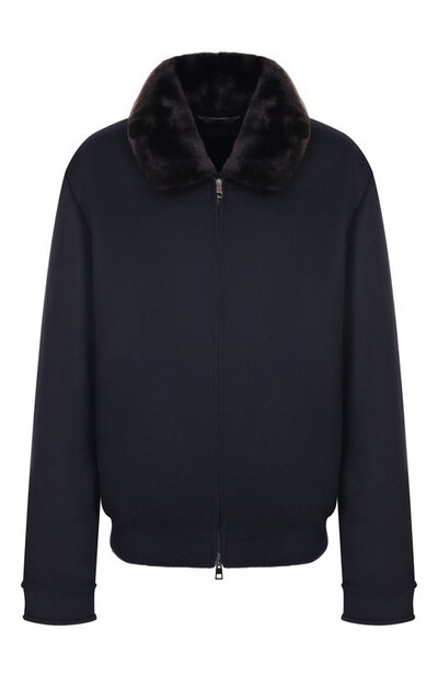 Бомбер с двумя врезными карманами и эластичным поясом из трикотажа в рубчик выполнили из кашемира. Куртка с подкладом из меха бобра и манжетами на пуговицах застегивается встречной молнией.