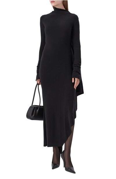 Длинное платье с асимметричным вырезом и присборенными рукавами выполнили из тонкого шерстяного трикотажа. На лифе сбоку и подоле с высоким разрезом модель декорировали драпировками.