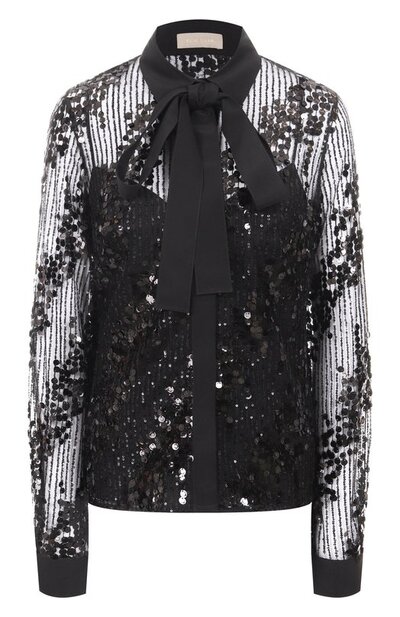 Блузку с отделкой из шелкового атласа выполнили из полупрозрачного тюля с полосатым узором из разноразмерных пайеток. Модель с супатной застежкой дополнили лентой, завязанной на бант под отложным воротником. В комплекте – нижний топ на тонких бретелях.