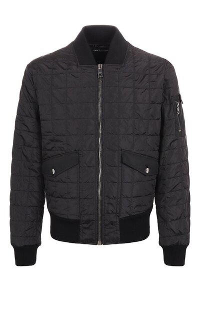 Нейлоновый стеганый бомбер дополнили воротником, манжетами и поясом из эластичного трикотажа в рубчик. У изделия предусмотрели боковые карманы с клапанами и нарукавный на молнии. Сзади модель украсили патчем с фирменной двухслойной пластиной.