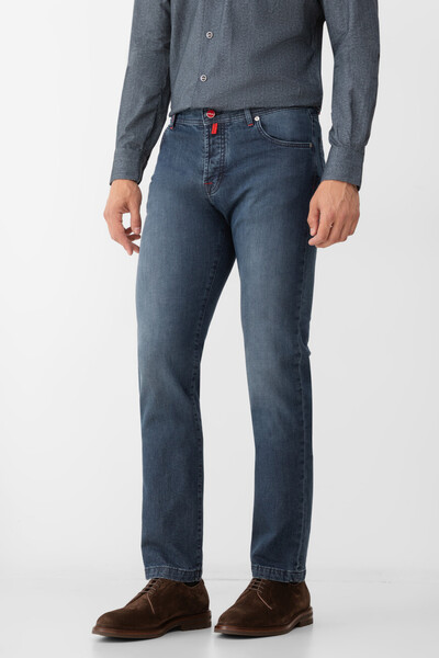 Повседневные джинсы Kiton с застёжкой на брендированные пуговицы. Модель из мягкого джерси на основе хлопка с добавлением эластичных волокон комфортно сидит по фигуре. В качестве декора дизайнеры использовали контрастные стежки на шлёвках под ремень, надпись-логотип бренда на пуговицах и прорезиненный патч на поясе. Изделие в классическом синем оттенке станет удачным завершением как расслабленного образа, так и более сдержанного аутфита в стиле casual.