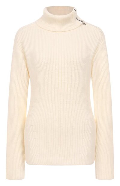 Полуприталенный свитер связали узором в рубчик из шерстяной пряжи. Высокую горловину с отворотом дополнили сбоку молнией, позволяющей сформировать разрез.
