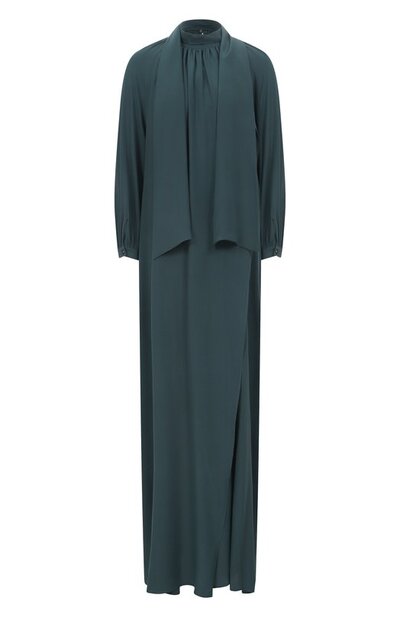 Свободное платье с диагональным разрезом спереди выполнили из полупрозрачного шелка. Воротник-стойку с потайной пуговицей дополнили широкими лентами-аскот.