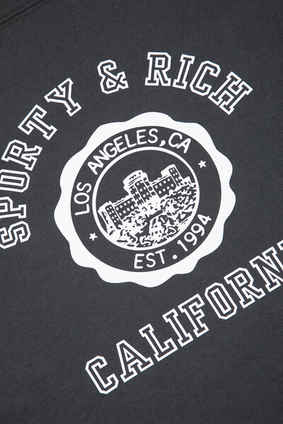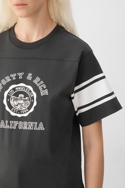 Хлопковая футболка от бренда Sporty&Rich укороченного силуэта. Изделие, созданное в Португалии на одной из лучших фабрик по производству флиса, украшено знаковыми элементами декора: крупные надпись-лого Дома и эмблема клуба по регби на лицевой стороне. Широкие рукава украшены контрастными полосками, придающими винтажный вид модели. Сочетайте футболку с шортами средней длины из той же коллекции.
