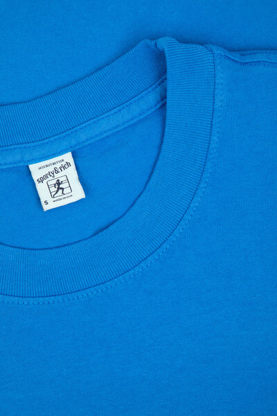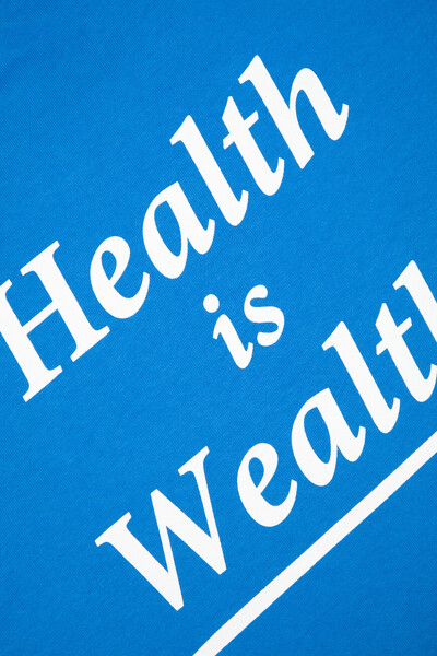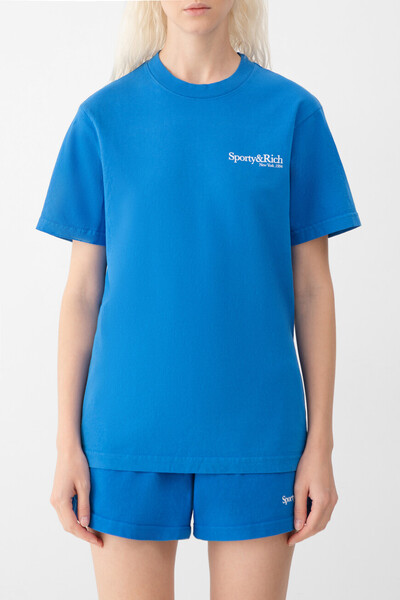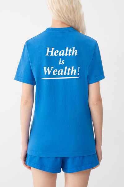 Яркая футболка синего цвета Sporty&Rich. Изделие выполнено из натурального хлопка, окрашенного в готовом виде. Модель расслабленного силуэта украшена белой надписью-логотипом, отсылающей к бренду, слева на груди, а на спинке расположился крупный мотивирующий принт, который в переводе звучит как «Здоровье – это богатство». Для создания цельного стильного образа, носите футболку с короткими шортами из той же линейки.