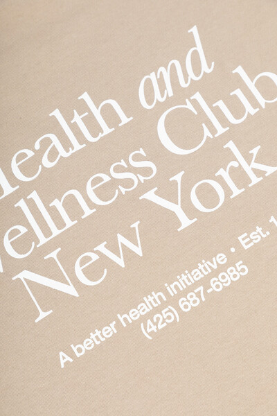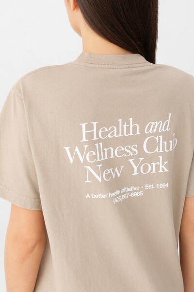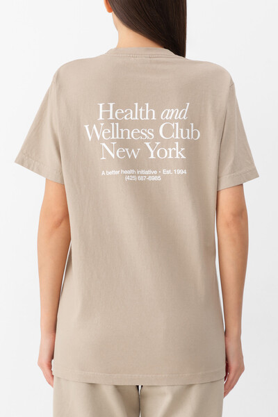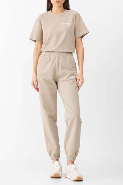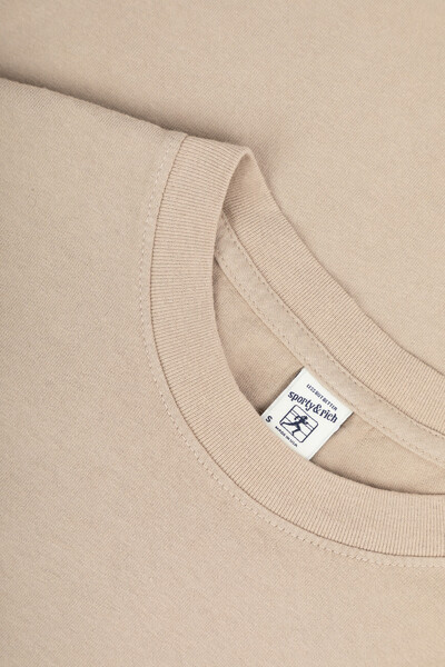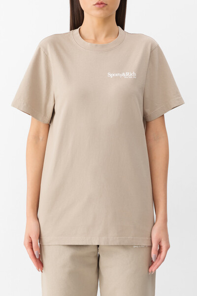 Бежевая футболка от бренда Sporty&Rich из 100% хлопка. Изделие тёплого бежевого оттенка украшено белой надписью-логотипом на груди слева и надписью с названием спортивного клуба на спинке. Деликатный декор напоминает о принадлежности к бренду и подчёркивает ваш особый стиль. Создайте монохромный образ с джоггерами из той же коллекции.