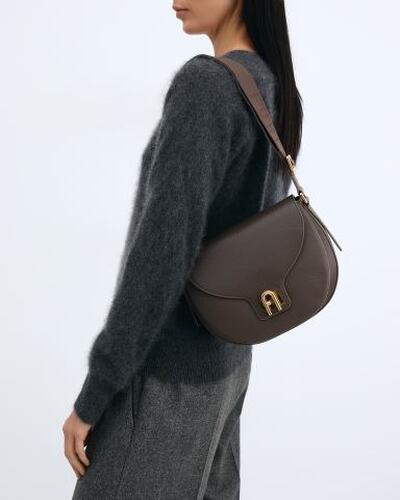 Сумка-седло FURLA выполнена из натуральной зернистой кожи. Брендированный ремень в тон регулируется по длине при помощи пряжки. Внутри — текстильная подкладка и карман на молнии. Аксессуар украшен фирменным поворотным замком с логотипом Arch.