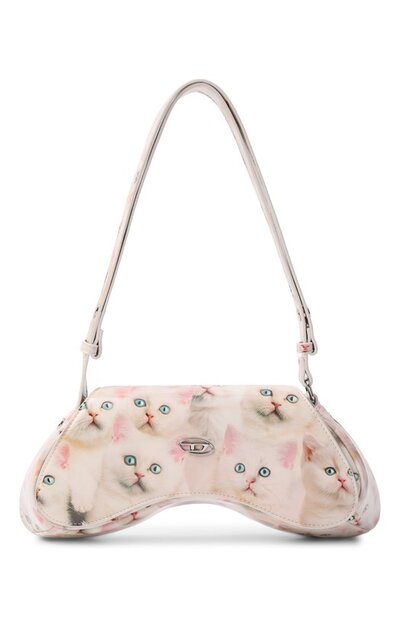 Сумку Play выполнили из глянцевого переработанного полимера с принтом в виде котят. Фигурный аксессуар с регулируемым плечевым ремнем и внутренним карманом украсили накладкой Oval D на откидном магнитном клапане.
