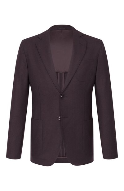 Пиджак выполнили из кашемира стрейч, а для изготовления полуподклада в тон использовали полиэстер с добавлением эластана. Модель дополнили нагрудным и парой боковых карманов.