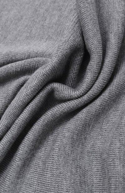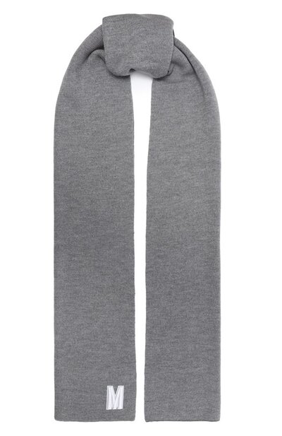 Для изготовления шарфа использовали меланжевый шерстяной трикотаж. Принадлежность модели бренду обозначили рельефной литерой M.