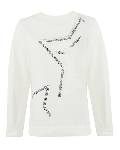 Этот свитшот— идеальное воплощение креативного современного стиля, объединившего комфорт и смелый дизайн в одном изделии. Изготовленный из приятного на ощупь трикотажа в нежном кремовом оттенке, он обеспечивает мягкость и уют, что делает его идеальным выбором для повседневного гардероба. Свободный крой добавляет расслабленности, создавая модный и непринуждённый образ. Главным акцентом служит геометрический принт, выполненный в виде стилизованных линий и точек, который добавляет динамики и графичности. Этот уникальный узор придаёт изделию современный характер и выделяет его среди других моделей. Круглый вырез горловины обеспечивает универсальность, позволяя легко сочетать свитшот с различными элементами гардероба. Манжеты и нижняя кромка выполнены в тонком трикотажном рубчике, создавая аккуратное завершение и поддерживая форму изделия. Мелкие декоративные надписи, вплетённые в общий дизайн, добавляют интригу и подчеркивают индивидуальность, привнося элементы арт-декора в повседневный образ.