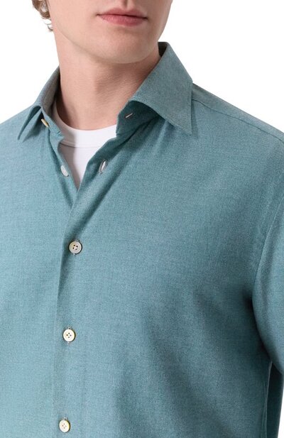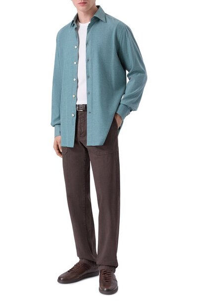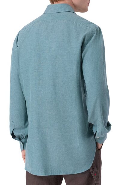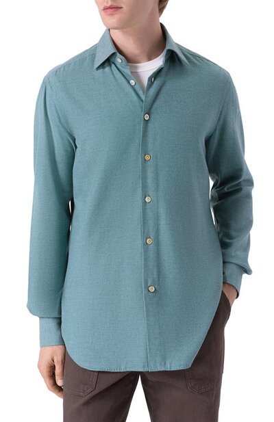 Рубашка с закругленным низом гармонично впишется в casual-образы. Для пошива модели на перламутровых пуговицах использовали меланжевую ткань из хлопка и лиоцелла.