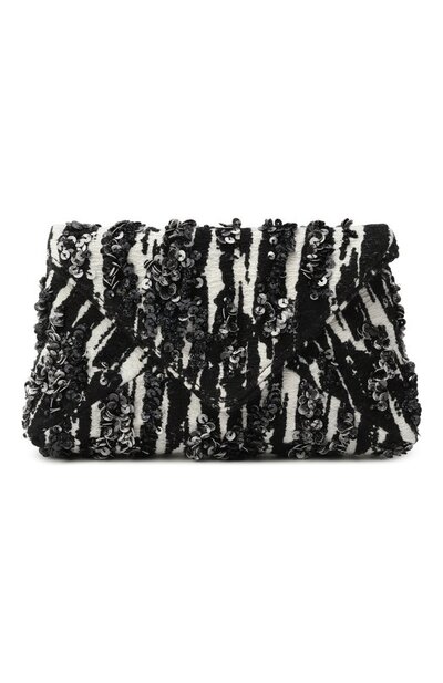 Клатч со съемным плечевым ремнем-цепочкой выполнили из жаккарда с полосатым мотивом, подчеркнутым вышивкой пайетками. Модель с внутренним плоским карманом закрывается клапаном с магнитной кнопкой.