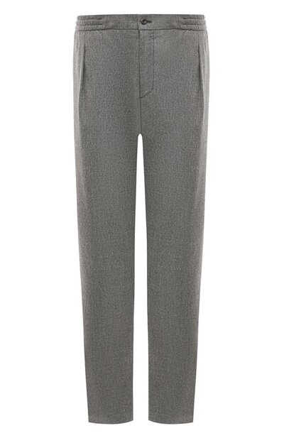 Создавая серые брюки, команда марки особое внимание уделила комфорту. Модель из мягкой ворсистой шерсти с добавлением волокон нежного кашемира сделали свободной, а на поясе предусмотрели эластичные вставки, поэтому он не сдавливает и максимально удобно облегает талию. Изделие с небольшими складками дополнили фирменной подвеской, продетой в петлю для пуговицы.