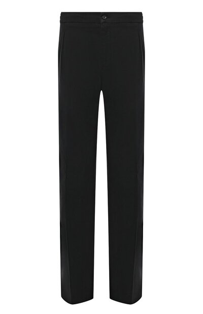 Черным брюкам привили спортивные гены с помощью эластичной вставки на широком поясе. Для пошива модели использовали мягкий хлопковый твил с добавлением шелковистой лайкры. Приятное на ощупь изделие почти не мнется и удобно садится по фигуре, не ограничивая движения.