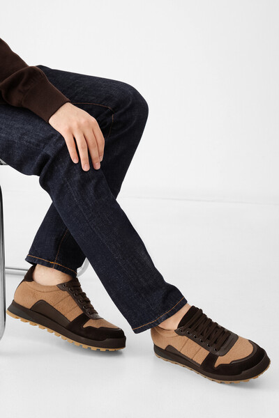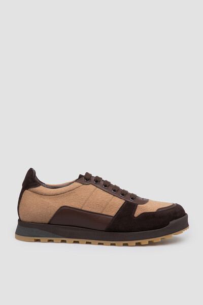 Сникеры Isaia из трёх видов материала. За основу взят фактурный текстиль бежевого оттенка. Для укрепления боков, задника и носка использовали вставки из гладкой кожи и мягкой замши. Перекрёстная шнуровка в тон кожаной планке придаёт визуальную целостность изделию. Эластичная подошва с глубоким протектором гарантирует удобство и устойчивость даже на скользкой поверхности. На заднике вышит логотип Дома – красная коралловая ветвь.