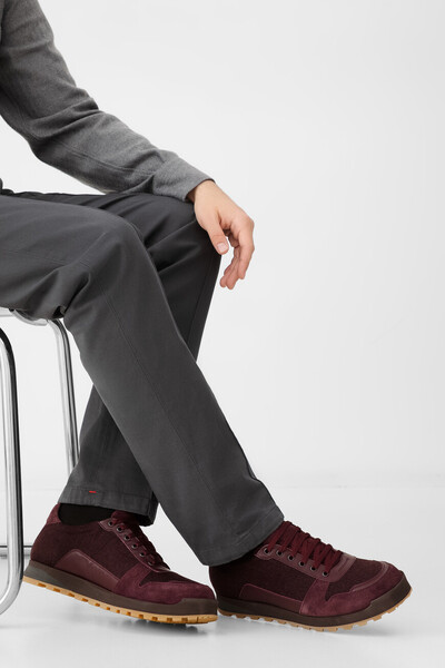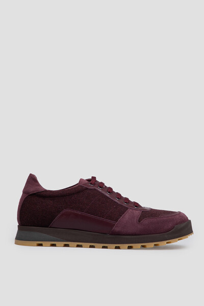 Кроссовки Isaia из мягкой замши и текстиля винного оттенка сочетают элегантность и комфорт. Модель с закрытой перекрёстной шнуровкой дополнена вставками из натуральной гладкой кожи, идеально гармонирующими по цвету. Двухцветная резиновая подошва с глубоким протектором обеспечивает устойчивость, а логотип на пятке и контрастная коралловая ветвь на заднике подчёркивают принадлежность к Дому.
