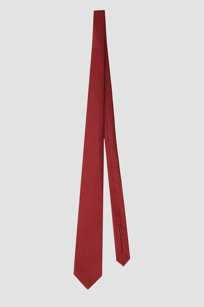 Isaia представляет яркий красный галстук из шёлкового сатина. Вкрапления белого и чёрного цветов делают аксессуар особенно выразительным и акцентным. Деликатный узор лишь дополняет динамику аксессуара, выполненного в технике seven folds. Фирменная эмблема скрыта на изнаночной стороне, не утяжеляя внешний вид изделия.