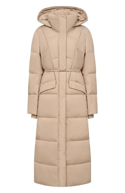 Пуховик Pamaxi4 с высоким воротником-стойкой дополнили съемными капюшоном и эластичным поясом с металлической пряжкой. Утепленное пальто с трикотажными манжетами выполнили из полиэстера с добавлением вторичных волокон. Модель с боковыми карманами застегивается молнией, скрытой под штормовой планкой на кнопках.