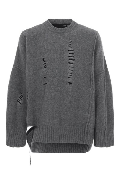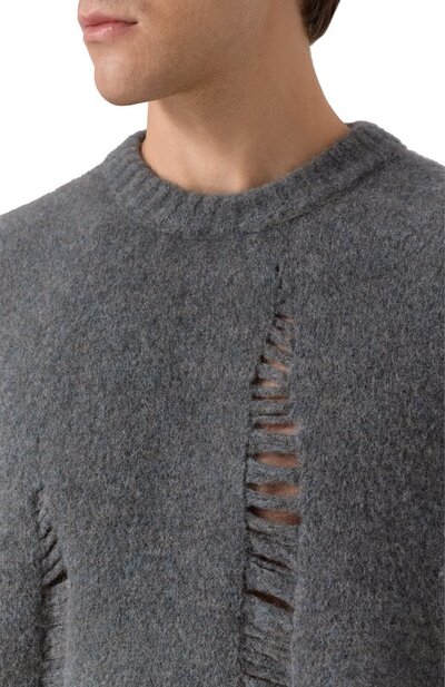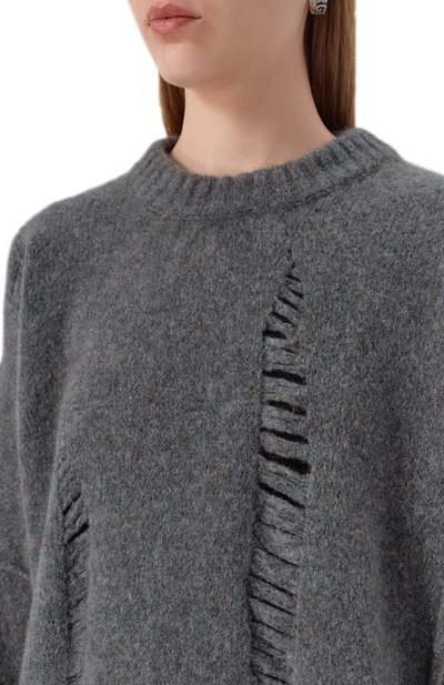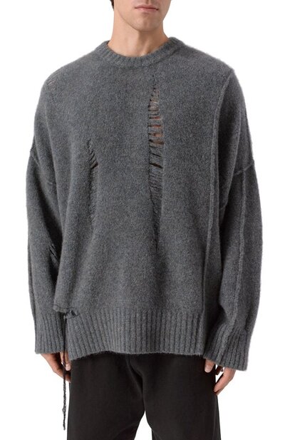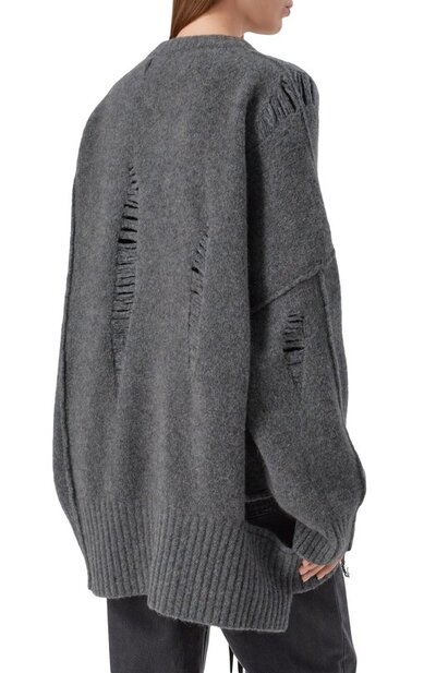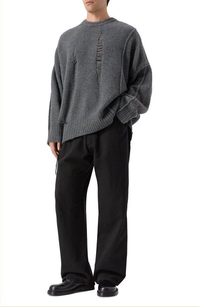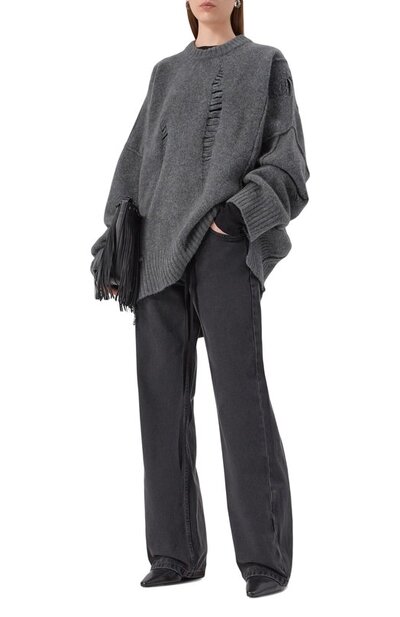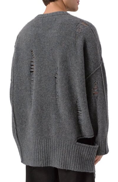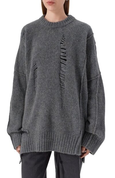 Oversize-свитер со спущенными петлями связали из смесовой пряжи на основе шерсти и руна яка. Справа модель с акцентированными швами дополнили разрезом, подчеркнув его стичингом и ниспадающей нитью.
