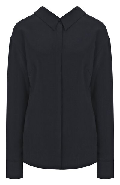 Блузку с супатной застежкой спереди и пуговицами сзади выполнили из стрейчевой шелковой ткани. Модель со спущенной линией плеч дополнили отложным воротником, обрамляющим глубокий V-образный вырез на спинке.