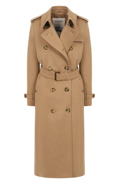 Двубортный тренч Kensington со шлицей сзади и двумя боковыми карманами выполнили из кашемира, а для подклада выбрали купро. Модель дополнили съемными патами на рукавах, погонами и поясом с пряжкой, обтянутой телячьей кожей. Само изделие застегивается пуговицами, а воротник с отделкой в фирменную клетку Burberry Check фиксируется крючком.